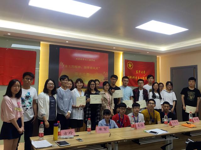 2018年5月4日下午,正值“五四”运动99周年及马克思诞辰200周年,材料学院团委在材料学院楼C321举办“承五四精神,扬青春风采”五四演讲比赛。材料学院团委书记吴佳、辅导员于伟男、彭璇、廉絮以及学生会副主席方玲出席,材料学院2017级学生代表参加此次活动。