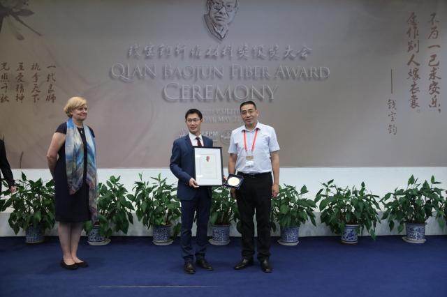 (程正迪为“钱宝钧纤维材料杰出贡献奖”获得者原埃因霍芬理工大学的皮特·雷姆斯特教授颁奖)
