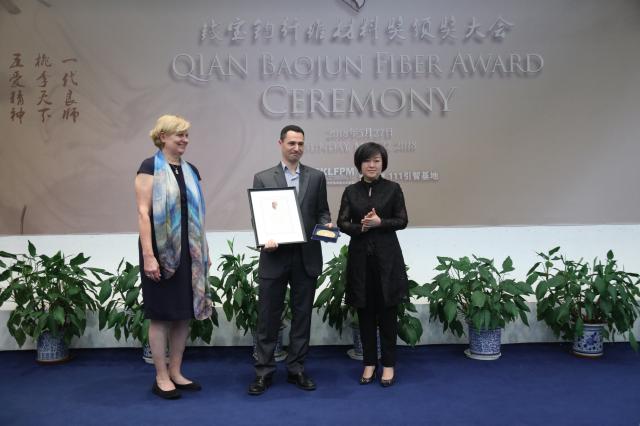 (刘春红为“钱宝钧纤维材料青年学者奖”获得者洛桑联邦理工学院的菲比·索瑞教授颁奖)