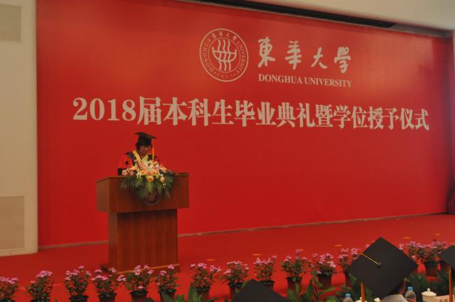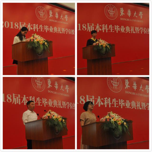 伴随着逐渐高涨的气氛,在校生代表肖娴表达了对师兄师姐的祝福与感谢,并表示有信心接过他们手中的薪火,去燃烧内心深处对于求知、探索、明理的渴望。2018届毕业生代表费奔回首四年的点点滴滴,表达了与同伴的彼此惦念,用在风浪中继续勇敢前行,东华必将以我们为骄傲抒发了毕业生对东华的真挚情感。教师代表陈惠芳教授感怀与2018届毕业生共度的美好时光,并表达了对毕业生的几点希望,鼓励他们谱写人生最美篇章。材料学院1988级本科生、1992级研究生,福建申远新材料有限公司副总经理宋满均先生作为从材料学院毕业的优秀校友,将他多年来的人生经验与社会阅历分享给了同学们。2018届毕业生王旻彦同学的母亲张青智女士作为家长代表用真诚的语言道出了心中的喜悦、骄傲和期待。