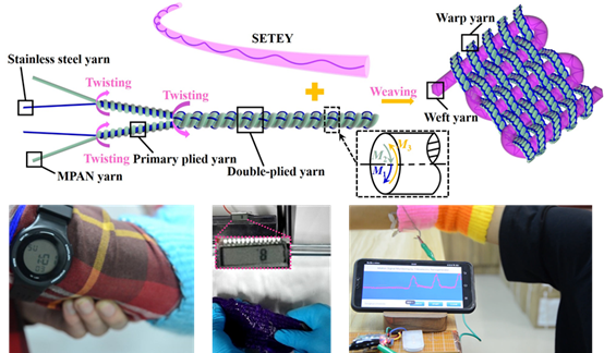 研究人员使用工业级的织样机将发电纱线进行编织得到了具有弹性的发电织物,其同样具有两栖工作的能力。发电纱线亦可与其他市售纤维如尼龙纤维、聚丙烯腈纤维等共同编织,纺织品的透汽性、舒适性、发电功率便可有效调控。研究人员穿着发电织物制成的“能源衣”,展示了其为电子设备锂电池充电、驱动无线信号传输系统、捕捉人体运动姿态等功能。