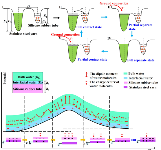 研究人员深入探讨了金属与非晶聚合物接触/分离的单电极势阱模型,发现非晶聚合物不仅作为隔离层防止纱线内场电势被外界环境气氛(气体、水等)消除,其界面的感应电荷竟能够与外界气氛分子发生耦合增益,由此本工作中首次提出了摩擦发电器件的电势/极化耦合效应的假设。借助特殊的皮芯结构设计与耦合增益发电机制,本工作报道的发电纱线无需借助与其他物体的相互作用即可自发电,并能够应用于不同气氛环境甚至是液体中。