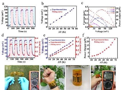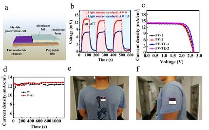 将n型和p型薄膜组装得到的温度敏感的热电手环,其不仅能够作为体征/环境温度传感器件,在低温差(70 K)下的相对高输出功率(23.6 μW)也使其成为随身能源装备的有益补充。例如,研究人员还将此热电器件与柔性光伏电池组装得到全天候持续供能的可穿戴光伏热电一体化器件,其中热电层可有效俘获光伏电池工作中产生的废热并将其转换成电能,在AM 0的标准光源下输出的热电势可达到13 mV。同时通过转移光伏电池工作过程产生的热量,实现对光伏电池降温,并将光伏电池的能量转换效率提高了约2%。