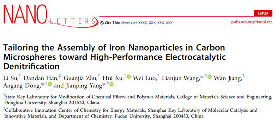 近日,我校材料学院江莞教授团队与复旦大学董安刚教授合作在硝酸根废水处理研究领域取得重要进展,相关成果以《裁剪铁纳米颗粒在碳微球中的组装用于高性能电催化脱氮》(Tailoring the Assembly of Iron Nanoparticles in Carbon Microspheres toward High Performance Electrocatalytic Denitrification) 为题,发表于国际著名期刊《纳米快报》(Nano Letters)。该论文的第一作者是材料学院16级博士生苏莉(导师江莞教授),通讯作者是王连军教授(pg娱乐电子游戏),董安刚教授(复旦大学)和杨建平研究员(pg娱乐电子游戏)。