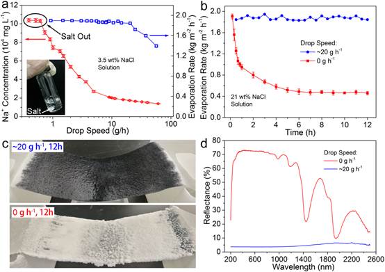 (4) 卤水浓缩。海水蒸发后所剩余的卤水可以通过装置下方的水槽进行收集,变废为宝,用于氯碱工业等多种工业领域,同时,通过调节滴速,卤水中的盐浓度可以得到调控,以3.5 wt%的NaCl溶液为例,通过调节滴速,卤水浓度最高可达到饱和(~26 wt%)。