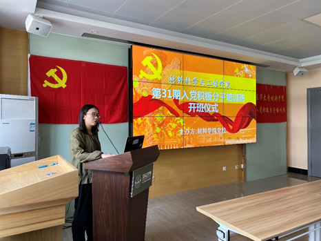 开班仪式上,学员代表梁宇航同学发言,他提出这是一次难得的机会,作为入党积极分子,我们要牢牢把握住这次机会,用自己的行动争取早日加入党组织,并代表全体学员向党组织表达了坚定的入党决心。吴佳老师向本期入党积极分子介绍了材料学院党校为期1个月的学习工作内容,并对学员表达了自己的期许与希望。吴佳老师表示,学员们应认真对待党校的学习,善学善思,积极关注时事热点,拼搏奋进,努力提高党性修养。同时,她希望学员们在专业学习上、生活上以及在言行上保持严谨与优秀,体现出自身的先进性。