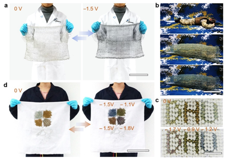 由于电致变色纤维的可控性、变色均匀性和纤维长度的提高,可使用针织机将电致变色纤维编织成大面积电致变色织物,在电压为−1.5 V时,织物颜色变为蓝色,在电压为0 V时,织物颜色恢复为灰色。利用电致变色纤维织物的颜色变化对人物进行伪装,展现了其根据周围环境变化进行自适应伪装的潜力。除了用于自适应伪装外,具有各种颜色变化的电致变色纤维还可以植入/编织到织物中,用于可穿戴显示。