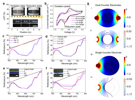 通过调节电致变色活性层制备参数(固化温度、传输速度等),使电致变色活性层均匀粘附在电极表面,活性层离子电导率可以达到3.07 × 10−3 S cm−1。此外,通过对比平行双对电极结构和单对电极结构纤维的变色效果,以及对纤维器件进行电势分布模拟,可以看出平行双对电极结构具有更均匀的电势分布,从而使电致变色纤维在长程范围上仍具有较好的变色均匀性。