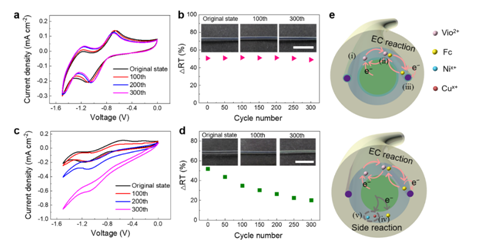 金属纤维表面涂覆的ITO层可有效减少电致变色活性层中离子与金属电极之间的副反应,从而极大地提高了电致变色纤维的电化学稳定性。300次循环后,纤维变色效果几乎不变。电致变色纤维外层的聚合物保护层有效提高了纤维的环境稳定性。电致变色纤维在100次弯折、100次水洗、20 h光照和30 h加热后仍具有较好的变色效果。