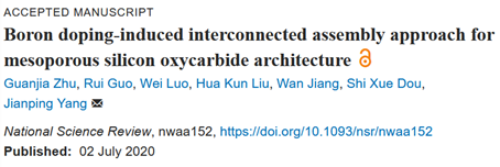 近日,我校材料学院杨建平研究员和江莞教授研究团队在纳米颗粒组装领域取得重要进展,相关成果以《硼掺杂诱导互联组装方法构建介孔SiOC多级结构》(Boron doping-induced interconnected assembly approach for mesoporous silicon oxycarbidearchitecture, DOI: org/10.1093/nsr/nwaa152)为题,发表于中国科技期刊卓越行动计划领军期刊《国家科技评论》(National Science Review),该论文第一作者是材料学院17级博士生朱冠家,合作者包括澳大利亚伍伦贡大学刘华坤教授和窦世学教授,pg娱乐电子游戏罗维研究员、江莞教授和杨建平研究员,pg娱乐电子游戏为唯一通讯单位。