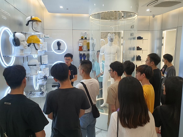 师生一行首先参观了公司位于闵行区的首个个人安全防护产品(PPE)研发实验中心---安丹达实验室。安丹达实验室整洁、有序,有着从原料研究到生产成型再到客户体验,一体化、快节奏的实验室模式。其中用户体验区模拟产品使用过程中可能遇到的各种状况,通过客户的体验来不断优化设计产品,让实验室所设计的产品更加符合消费者的需求。