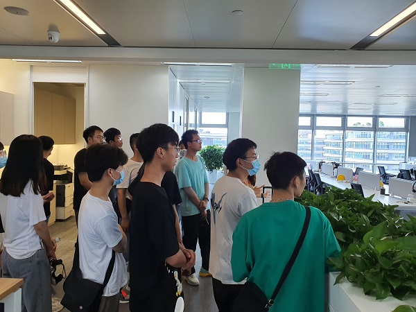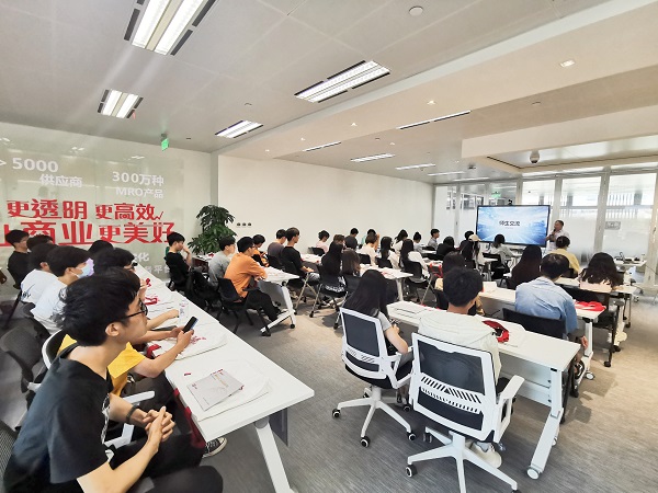 在震坤行总部,师生一同参观了3A楼层的员工餐厅,前台接待大厅和核心办公区域。在交流活动中,企业相关负责人介绍了震坤行工业超市的平台运行模式、产品运营模式、交易平台以及智能化服务相关产品。同学们也和公司相关负责人进行了面对面交流,了解了企业人力资源体系,研发岗、管理岗、职能岗、供应链、销售类等岗位情况,加深了对企业的了解和认识。