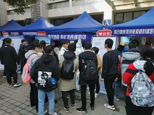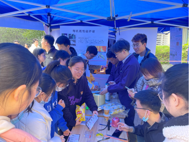 活动现场,在课题组展示区,蒙学善问泰定求真课题组、高性能纤维课题组、结构功能一体化新材料课题组、聚合物基环境能源材料课题组、聚酰亚胺材料研究中心、碳纤维课题组、先进功能材料课题组、功能材料与资源环境课题组以及功能弹性体课题组等9个课题组师生用生动的语言深入浅出地向参观同学进行介绍,全面展示了课题组长期以来的研究成果,既关注研究的科学理论,更强调产学研用的深度融合。展示内容包括柔性电子材料与器件研究、碳材料基柔性可穿戴传感器的研究、催化剂的催化转变、高容量有机负极材料及其全电池应用、功能导向共轭聚合物框架材料的设计与合成、仿生弹性体在生物医学领域的应用、材料界面调控及能源环境应用研究、贵金属纳米晶玻璃在光通信领域的应用、有机高性能纤维在消防服上的应用等多领域。先进功能材料课题组的李克睿老师表示,此次参与“材料日”展示,希望为低年级同学提供一个专业学习、科研启蒙和实践交流的开放平台,今后课题组也会持续加强与学生的互动交流,不断提升学生的专业技能水平和实践创新能力。