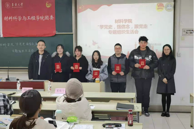 为深入学习贯彻习近平总书记“七一”重要讲话精神和党的十九届六中全会精神,落实“学史明理、学史增信、学史崇德、学史力行”的要求,12月21日,材料学院2003团支部开展“学党史,强信念,跟党走”专题组织生活会。校团委副书记、研究生会秘书长邵楠,材料学院团委书记塞依丁等与会。