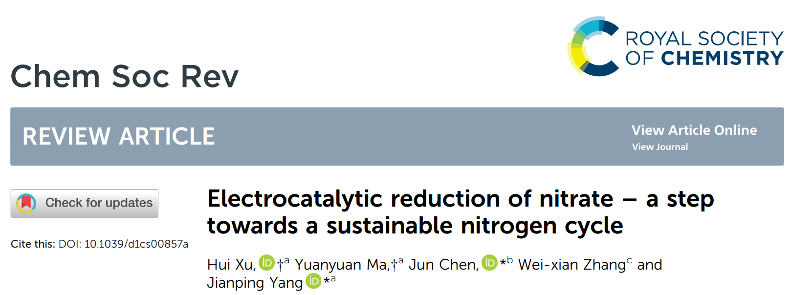 近日,材料学院杨建平研究员课题组与澳大利亚伍伦贡大学陈俊教授合作,在国际知名期刊Chemical Society Reviews上发表题为“Electrocatalytic reduction of nitrate – a step towards a sustainable nitrogen cycle”的综述文章。该综述文章总结了电催化还原硝酸盐的基本原理,包括反应机理、反应器设计原则、产物检测方法和性能评价方法,并汇总了过渡金属(尤其是贵金属和合金)、铜基电催化剂和铁基电催化剂近期在电催化硝酸盐还原方面的研究进展。