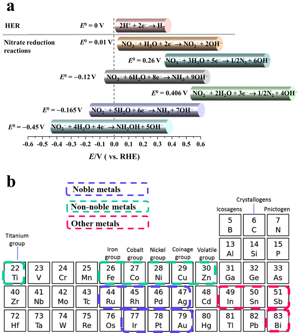 图2. a)在标准条件下(1.0 atm,25℃),水介质中主要电催化硝酸盐还原反应和HER热力学电势。b)报道中常见的用于硝酸盐还原的金属元素。