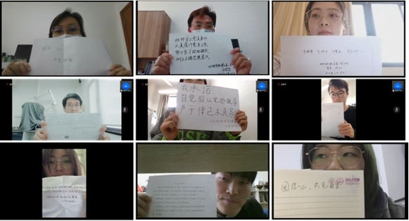 活动中还举行了“亮身份、做表率”党员践诺行动。汪俊俊谈到,作为一名博士生党员,我要始终牢记党员身份,认真履行党员义务,积极服从学校防疫政策,在平凡的岗位上扎扎实实做好每一项工作!在他的倡议和带领下,大家纷纷打开摄像头,分享了一个个朴实而充满力量的承诺。