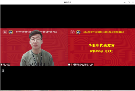 毕业典礼上,卓越高分子1801班刘雨欣、材料193硕周大旺分别作为毕业生代表发言。刘雨欣同学讲述了自己的大学四年由稚嫩变得更加自信、果断、踏实、坚定的成长蜕变,倡议同学们以德行为立人之本,以学识为发展之根,磨炼意志,求真务实,发扬“崇德博学,砺志尚实”的校训精神,以“东华青年”之名扬帆起航。周大旺同学在发言中表达了对母校和母院的感谢。从入学之初提供优化的课程体系和完整的实验设备,资助科研立项,组织学科交流,到读研期间导师以身作则、悉心栽培,再到毕业季搭建宽阔的就业平台以及严峻的疫情防控攻坚战中向春季毕业生们伸出温暖臂膀,学校和学院无时无刻的关心指导让他内心充满感动。他希望全体毕业生用求真务实,脚踏实地的态度实现人生理想,用成长和成才继续展现东华材料人的风采。材料212硕杨雨箫同学作为在校生代表发言。她感到,毕业生们严谨求知的学习精神、乐观向上的处事风格、求真务实的科学态度为全体在校生留下了宝贵的精神财富,她代表在校生立志以优秀的毕业生们为榜样,刻苦学习,脚踏实地,努力钻研,勇于创新,争取早日成才,肩负起为母校争光、为国家效力的重任,用青春和智慧续写辉煌的篇章。