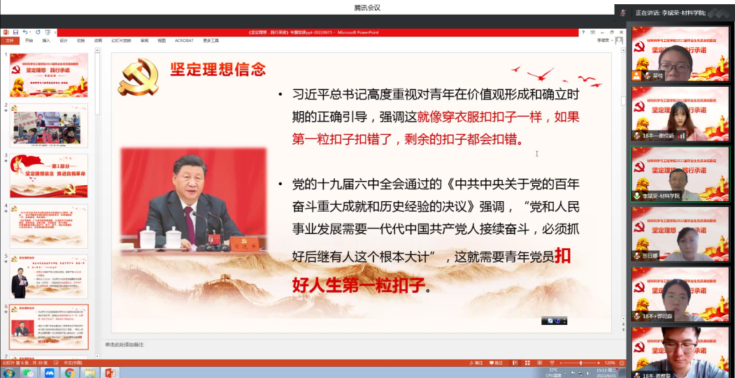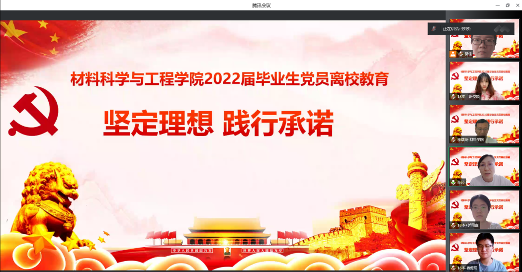6月21日,pg娱乐电子游戏举行“坚定理想践行承诺”2022届毕业生党员离校教育活动,学院党委书记李斌荣、党委副书记莎日娜、学生党建辅导员吴佳以及毕业生辅导员于伟男、江琪然以及全体2022届本硕博毕业生党员与会,会议由党委副书记莎日娜主持。