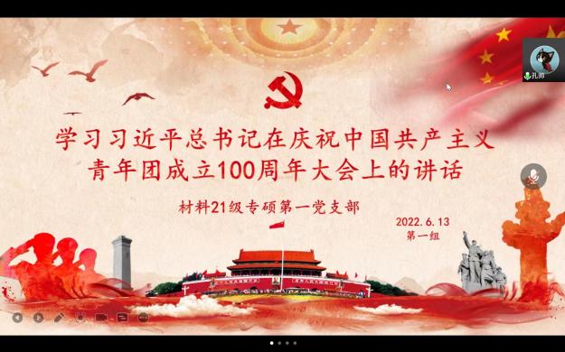 近日,pg娱乐电子游戏材料21级专硕第一党支部采用线上学习的形式开展以“学习习近平总书记在庆祝中国共产主义青年团成立100周年大会上的讲话”为主题的组织生活,会议由党支部书记孔帅同志主持。