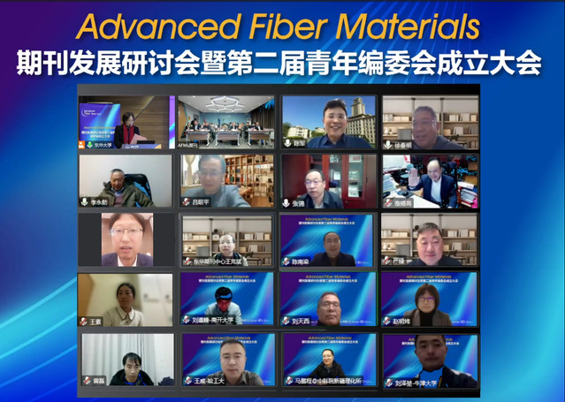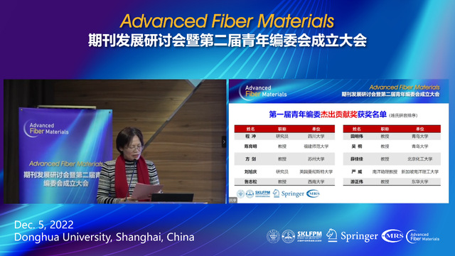 期刊主编朱美芳院士充分肯定了第一届青年编委对期刊发展的重要贡献,并为10位青年编委颁发杰出贡献奖,分别是四川大学程冲研究员、福建师范大学陈育明教授、苏州大学方剑教授、英国曼彻斯特大学刘旭庆研究员、西南大学鲁志松教授、青岛大学田明伟教授和吴桐教授、北京化工大学薛佳佳教授、新加坡南洋理工大学严威助理教授、pg娱乐电子游戏游正伟教授。会上,聘任了73位国内外青年学者为期刊的第二届青年编委,包括昆士兰大学Mike Tebyetekerwa、牛津大学刘泽堃博士等来自国内外纤维及纤维跨学科领域的青年学者和行业专家。她向受聘的青年编委表示热烈的欢迎,并对他们寄予厚望,希望青年人能带动国际材料领域的学者,一起努力将Advanced Fiber Materials期刊办成国际一流学术期刊,推动纤维材料学科的发展。