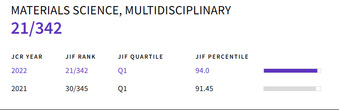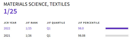 2023年6月28日,科睿唯安发布《期刊引证报告》(Journal Citation Reports,简称JCR),Advanced Fiber Materials (先进纤维材料) 期刊的影响因子持续稳步上升,从首次的12.958 (2022年6月发布) 上涨到16.1,影响因子增长24%,在JCR交叉材料学科(Materials Science, Multidisciplinary) 中排名跃居前6%,处于该领域Q1分区,在JCR纺织材料学科(Materials Science, Textiles)中持续排名第一。