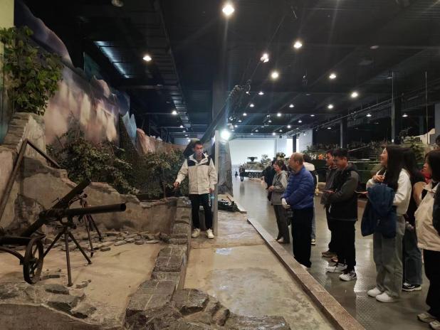 (退役大学生士兵曹聪在重兵器陈列馆向同学们介绍“迫击炮”)