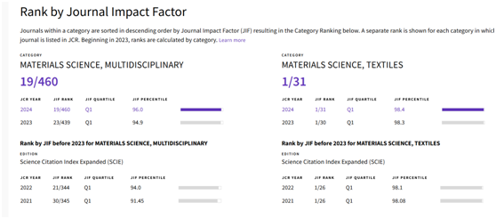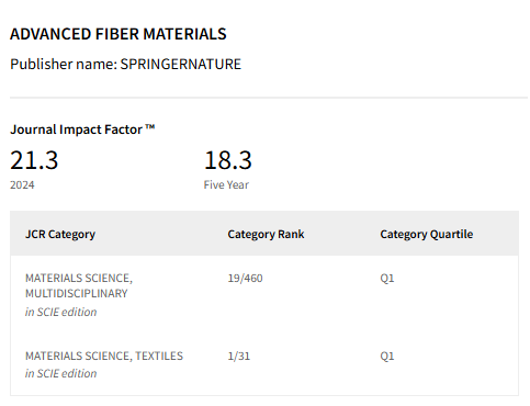2025年6月18日,科睿唯安发布《期刊引证报告》(Journal Citation Reports,简称JCR),《先进纤维材料(英文)》(Advanced Fiber Materials)期刊的影响因子持续稳步上升,从去年的17.2增长至21.3,影响因子增长近24%,在JCR材料科学(MATERIALS SCIENCE, MULTIDISCIPLINARY) :综合领域排名提升至前5%,处于该领域Q1分区;在材料科学:纺织领域 (MATERIALS SCIENCE, TEXTILES) 中连续4年排名第一。