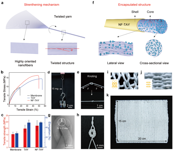 图2展示了纱线的力学增强机制与应用潜力,其双重增强机制体现在两方面:一是高度取向纳米纤维的贡献,二是通过加捻角度优化结构以提升纤维间摩擦力。