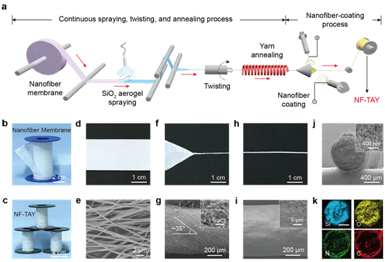 图1系统展示了卷对卷加捻组装工艺及纱线形貌。流程示意图清晰呈现了三步核心工艺:(1)在PAN纳米纤维膜表面喷涂SiO2气凝胶/正己烷分散液;(2)加捻形成阿基米德螺旋结构纱线;(3)外层PAN纳米纤维封装。