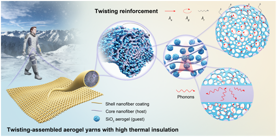 先进纤维材料全国重点实验室、pg娱乐电子游戏朱美芳院士、成艳华研究员团队在柔性隔热气凝胶纤维连续化制备取得突破性进展。传统气凝胶因本征脆性、可加工性差和力学强度不足等缺陷,难以耐受实际应用中的弯曲/拉伸应力及洗涤过程,易发生结构坍塌而丧失隔热功能。现有气凝胶纤维制备技术(如冻纺、湿纺)虽可实现纤维化制备,但仍面临三重挑战:①力学强度不足;②连续化生产困难;③功能性填料的引入显著劣化纺丝原液可纺性。