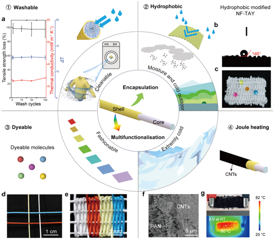 图4展示了气凝胶纱线的功能扩展与实际场景适配性。 研究团队验证了其优异的水洗稳定性:经100次洗涤后,气凝胶纱线强度损失<3%,且隔热性能基本保持不变。此外,通过外层纳米纤维的功能化改性,纱线实现了疏水性(接触角146°)、可染色性及焦耳加热性能(8.2 V下升温至25 °C),从而满足不同应用场景与个性化需求。