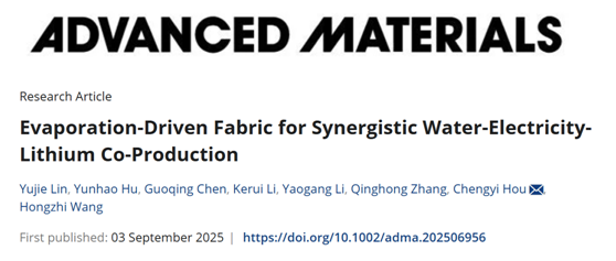 近日,该成果以“Evaporation-Driven Fabric for Synergistic Water-Electricity-Lithium Co-Production”为题,发表在国际期刊《先进材料》(Advanced Materials, 2025, 10.1002/adma.202506956)。论文第一作者为我校硕士生林宇杰和博士生胡云浩,通讯作者为侯成义研究员。